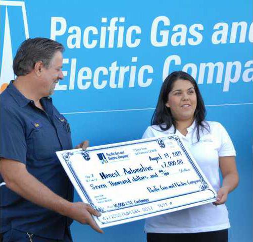 John Vanderwerf hosted the Manteca Chamber of Commerce coffee Wednesday morning at his Moffat Boulevard Honest Automotive business where he received a check from PG&E for $7,000.