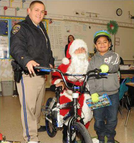 Officer Smith stood with Santa and his elves and told the class of 30 that they had come to bringing gifts to all of them and especially to that one student who had been forgotten in 2013 – Eduardo Mejia was sitting in the first row nearest to them. The boy seemed to be stunned in seeing Santa so close after hoping to see him this year.