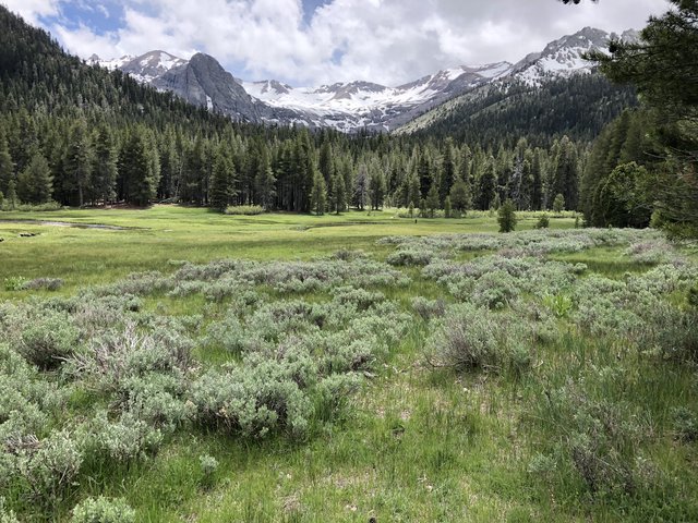 Before me was the greenest green grass you can ever hope to see ringed by snow- capped mountains against blue skies filled with fluffy clouds while the sound of rushing water in the nearby Kennedy Creek making its way toward the Stanislaus River combined with chirping birds to create a perfect high Sierra symphonic melody.