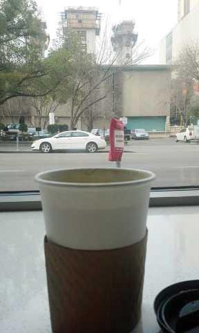 As for me, I stayed nearby, sipping a cup of Freedom ‘Red Eyed’ java – next door to the San Joaquin County Administration Building – while sitting on one of stools facing the soon-to-be-replaced SJC Superior Court building.