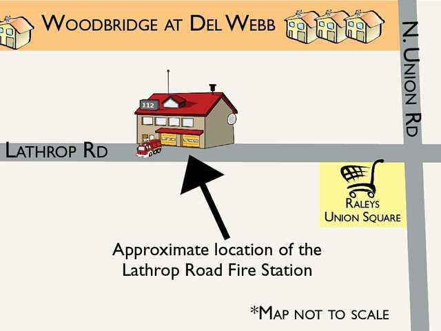 The proposed station on the north side of Lathrop Road west of Union Road is part of the 1,406-home Del Webb at Woodbridge neighborhood. The design for the station incorporates single-family home elements on the sides that will face future homes and commercial -style elements for the sides facing future retail development. Construction materials will employ cement plaster and stone veneer for the exterior walls of the 7,173-square-foot structure. The elevations will also include aluminum windows and a tile roof.