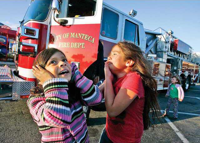 Natalie Exiga, left, and Andelina Serna cover their ears as the horn to the Manteca aerial platform truck goes off.