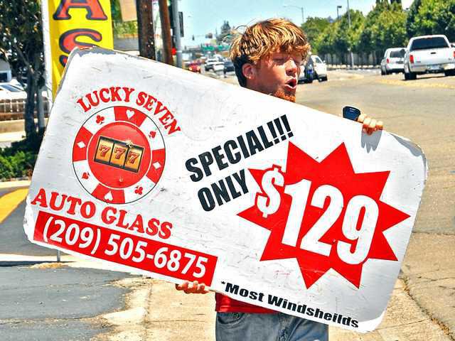 Chris Kroshus, 23, who hopes to return to school and become a psychologist, had first waved his signs on East Yosemite Avenue for a pizza parlor located in the Spreckels Park shopping center near the Commerce Avenue intersection.