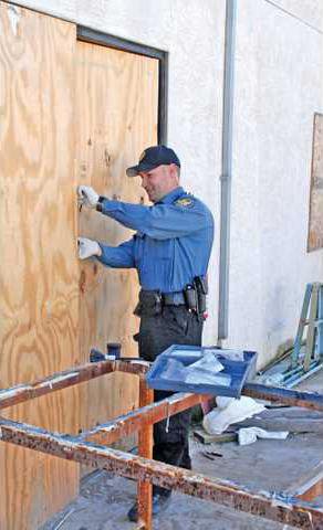 Community service officer Alan Shupperd was at the Industrial Park Drive location Saturday morning to log the damage and secure finger prints for the investigation. The three doors had padlocks cut and the doors pried open as well to bypass the bolts. A public works’ crew was called out to repair the doors and to secure the building.