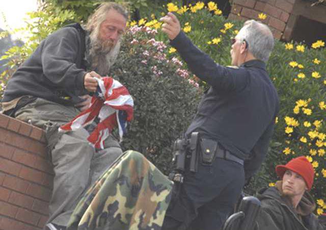 Officers Joe DeAngells and Randy Chiek confronted the man within five minutes who initially said he didn’t know anything about flags. DeAngelis told him to take the bulge out from under his sweatshirt exposing the red, white and blue fabric.