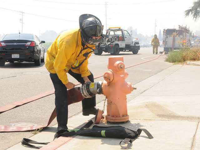 The first to arrive on the scene driving into the smoke that was flooding into Yosemite Avenue traffic was Manteca Tow Company owner Dennis King. King took it upon his self to activate the emergency lights on his tow truck to direct traffic. He was on the scene for about an hour witnessing the fire jump over Yosemite Avenue and ignite a field of weeds on the south side of the roadway.