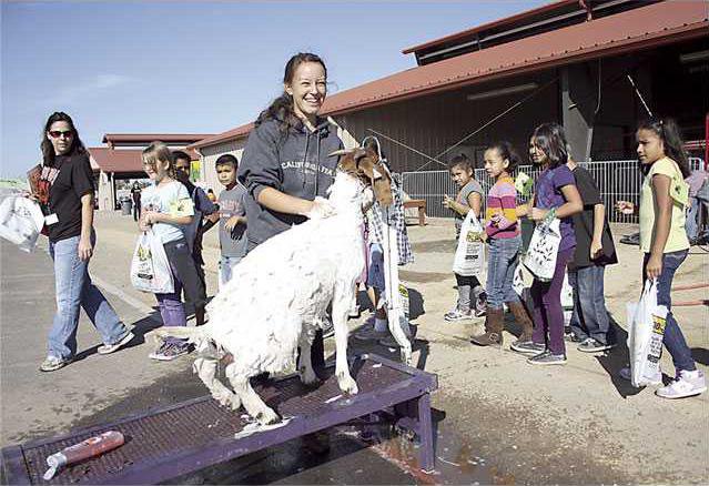 They learned how almonds are grown, processed and packed in boxes that are sold at the stores.They saw how sheep are sheared, and how to give a goat a bath.They were challenged to plant and grow a cabbage seedling, and then were told to enter the fruit of their labor in a contest that could earn them $1,000 in scholarships next year, just as a New Haven School fourth grader did last year.And, they learned how to square-dance - "a great way to exercise on a rainy day inside," according to a member of the San Joaquin Valley Square Dance Association.The nearly 4,000 third graders from various schools in South San Joaquin County experienced all of these firsthand, and more, Wednesday during their field trip at the Manteca Unified School Farm on Louise Avenue made possible by the AgVenture project.The young students, who rode in school buses to the farm in groups from 9 a.m. to 1 p.m., learned about the different aspects of agriculture and how this brings food to their dining tables not only from their tour of the animals and vegetables at the school farm, but also from the many different ag-related displays that included a number of mammoth machines used in farming such as tractors, a hay baler, and a disc farm equipment.A group of young 4-H members from Livermore joined the San Joaquin Valley Square Dance Association in giving the dance presentation. "They do square dancing as a 4-H project. They love it," association director Margaret Miller said.During their dance demonstrations, the students along with some of the parents had an opportunity to learn the dance steps and actually do a performance with the 4-H and association members.In the Bonnie Plants booth, Randy Beasley explained to the children how to grow a healthy cabbage plant in the garden or in a container filled with all-purpose potting soil.