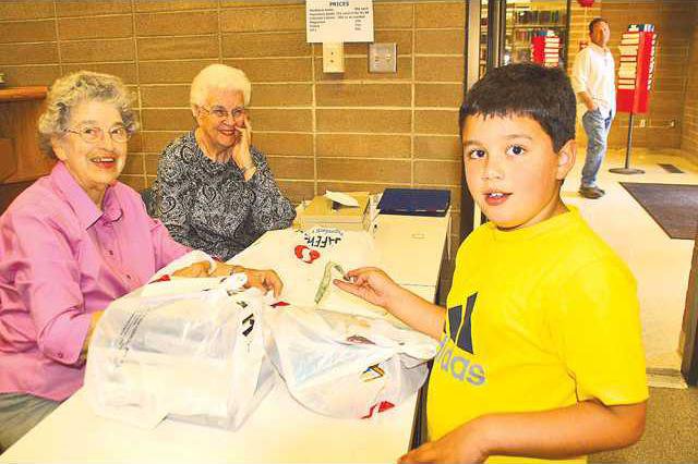 Jonathan Sanchez smiled as he handed his dollar bill to Friends of the Library volunteers Bettie Christie and Carroll Zwinge.