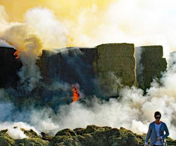 The hay fire was still smoldering early in the evening. Neither fire personnel nor the owners of the dairy could hazard a gaze as to how long the fire will continue to smolder.