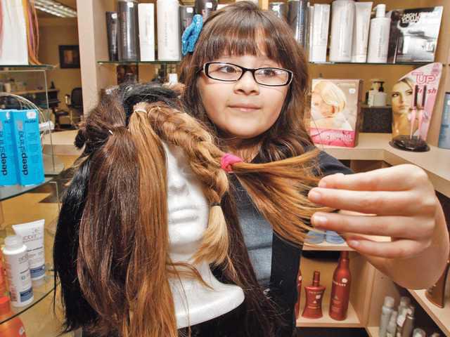 The 7-year-old Manteca girl had her hair lopped off at Sadie’s Styling Salon for Locks of Love, a non-profit organization that provides hairpieces to financially disadvantaged youngsters suffering from hair loss due to medical treatment for cancer and other diseases.