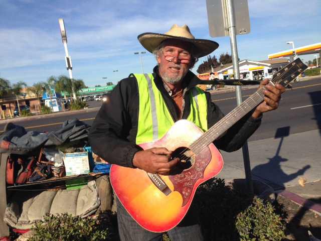While playing his guitar near the fast food restaurant and around town, he said he only plays for tips from the public. He said there is nothing on his cardboard signs that ask for money — saying he is only playing for tips.