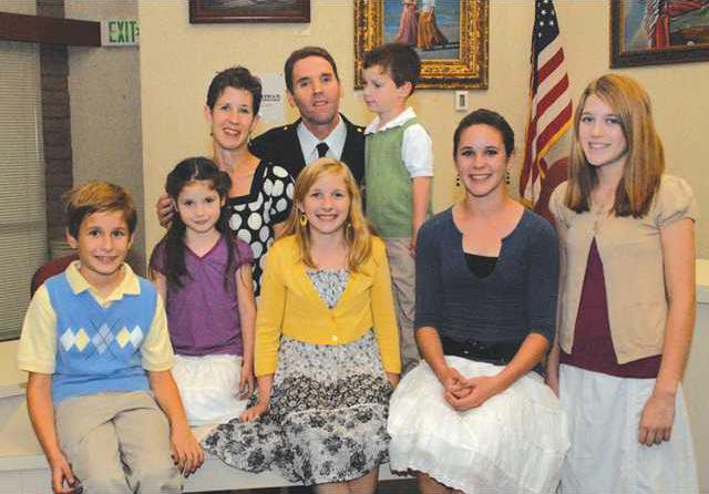City Clerk Joann Tilton administered the oath of office to Waters as he stood in front of the council table with his wife Shelly at his side and their six children watching from their front row seats. His parents Dahl and Gail Waters sat next to them. His father is also a veteran of the fire service.