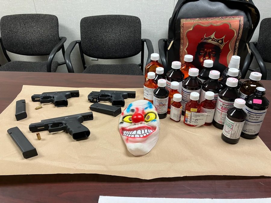 More than a dozen bottles of liquid medication – much of it controlled substances – were recovered, along with three semi-automatic handguns, magazines, and a clown mask.