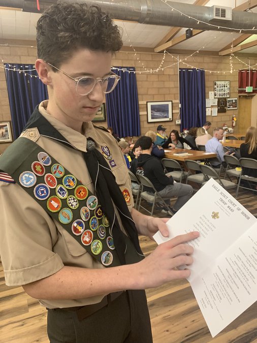 Joining Waters in the Eagle Scout Court of Honor on Tuesday at the Ripon VFW Hall from Boy Scout Troop 440 – which is affiliated with the Ripon Ward of the Manteca Stake of the Church of Jesus Christ of Latter-day Saints – were Spencer Ogden, Bryce Eldredge, Maika West, Aaron Wood, Kai West, Landon West, Matthew Gravina, Grant Ogden, and Ty Herrin.