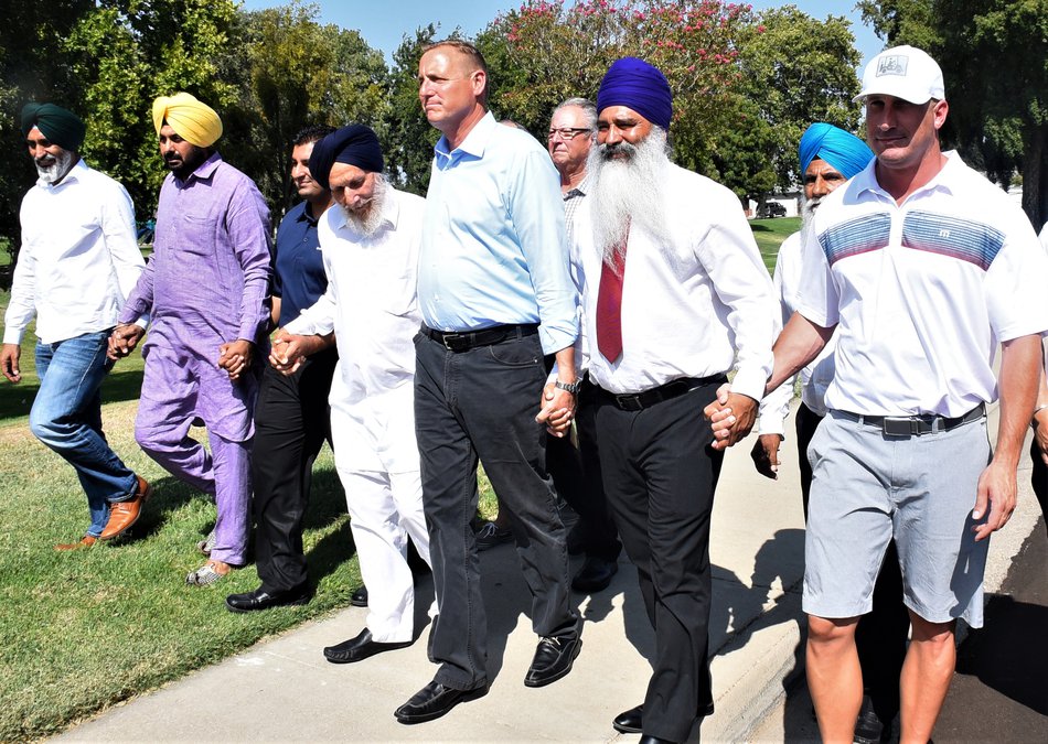 The walk was led by Congressman Jeff Denham and State Assemblyman Heath Flora who were unable to attend the scheduled peace walk at 6 p.m. Peace Walk around the Graystone Park on Agate Avenue where Sahib Singh had been kicked and spit upon some 13 days ago. Denham said he had to schedule the second walk at 3 p.m. because of a previous conflicting engagement in Sacramento. He brought Surjit Malji, 50, of Keyes with him to join in the heroes walk. Malji had also been assaulted recently.
