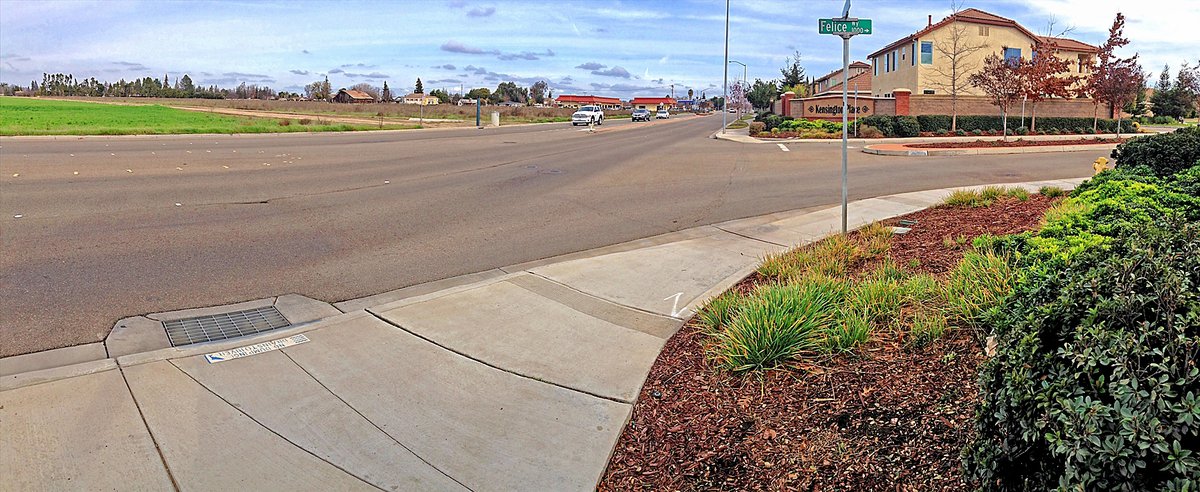 The basic functional design will be similar to the roundabout on four-lane 11th Street just west of Interstate 5 where it intersects with West Gantline Road/Kasson Road on the way to Tracy. Two lanes of eastbound and westbound Louise will wrap around the landscaped roundabout. At the same time Felice Way will have one travel lane in each direction feed into the roundabout. Typically roundabouts have yield signs and not stop signs.