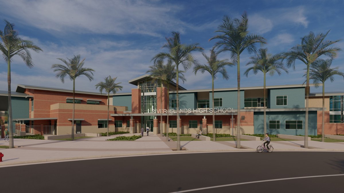 Palm trees and bricks will send a clear message to the world about what River Islands High is all about — academic achievement. The new campus designed for 1,600 students that is now under construction in the 15,001-home planned community of River Islands at Lathrop will have two unique elements for the Northern San Joaquin Valley.