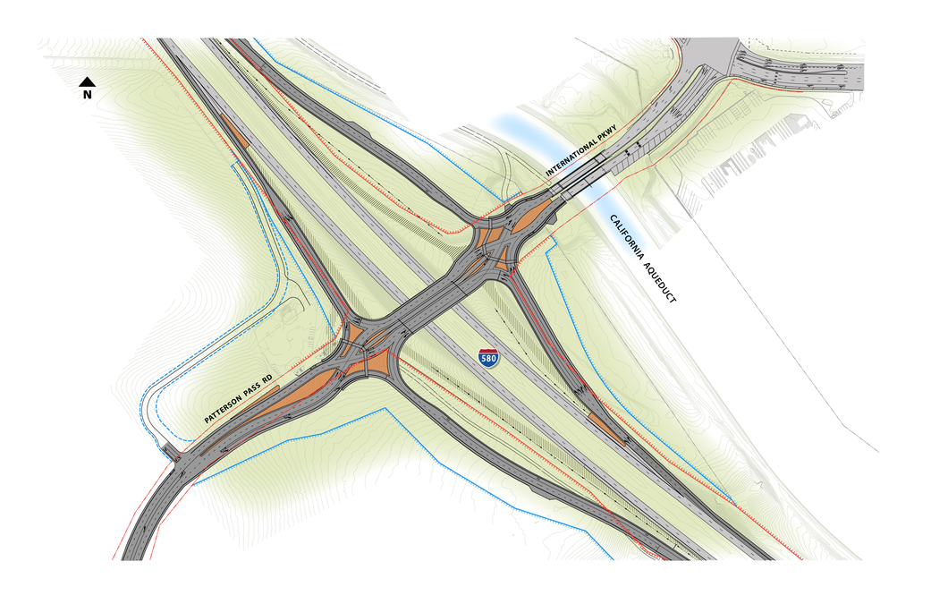 The I‐580 at International Parkway interchange project will reconstruct the existing interchange, widening the on- and off-ramps, and widen the freeway overcrossing to increase traffic capacity and truck throughput. The project will modify the current configuration to a diverging diamond interchange. This design will allow for free movements onto the interstate, improving safety and access to important freight routes. The new I‐580 Interchange will also include continuous Class II bike lanes and sidewalks, providing safe passage for bicycles and pedestrians over the freeway.