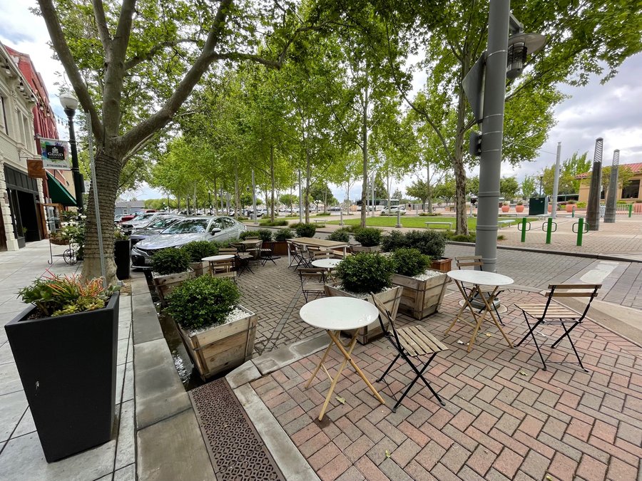 Early Saturday afternoon they were no longer accepting reservations at the Town & Country Café in downtown Tracy. The crowd spilled over from a sidewalk dining area to a portion of street parking blocked off by bright orange K-rail style barricades along with extensive planters, tables, chairs, shade trees and patio umbrella shading that the café shared with the Jasmine Thai restaurant that had yet to open for the day.