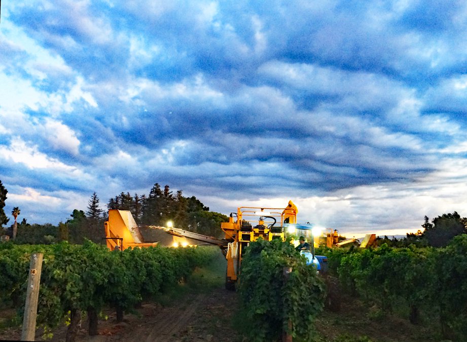 The tall and noisy mechanical grape harvesters were deployed in the Gallagher grape fields at Oleander Avenue and Coelho Drive late last week, with several agricultural machinery and seasonal workers hard at work in the early evening.