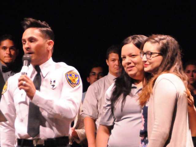 Life saving memories and fleeting words of caution are often shared at the Every 15 Minutes program every year during the two-day event at Manteca High’s Gus Schmiedt Field. This year was no different.The story of a 2012 high school senior who had never taken an alcoholic drink in her life and nearly died during a party at the home of a friend was shared with those attending. It was a freak accident after she had taken a drink and became dizzy – unconditioned to drinking.Joey Macias, police chaplain and a Senior Pastor of the Christian Worship Center on Button Avenue, called the victim and EMT Angela Ott up to the lectern.