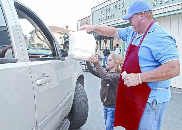 About a dozen volunteers handed out more than 500 meals Thursday evening at Fagundes Meats in Manteca where the drive-thru dinner fund-raiser was held coordinated by Brian Corcoran. The DVI correctional officer organized the event to help his childhood friend, Richard “Richie” Guillermo, who lost his wife, Michelle “Shell,” unexpectedly last month following surgery. She left behind her husband and their three children, 3-year-old Sami and the twins Abbigail and Gabriel who are turning two this month. The two worked side by side in assembly-line fashion, along with other volunteers, in front of Fagundes Meats putting together the freshly barbecued beef and chicken with all the trimmings in individual food boxes that were handed out to ticket holders as they drove through the parking lot.