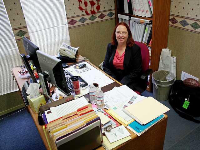 She settles behind two computer screens, which sit next to two water bottles. There are stacks of files and rows of binders and a cluster of what looks like blueprints. The space is adorned with a signed football and dream catcher.