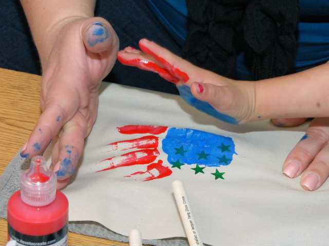 On Friday other kindergarteners, first and second grade students continued the art of having their hands painted red, white and blue and pressing their palms into the white quilt squares, signing their names on the bottom of their art work.