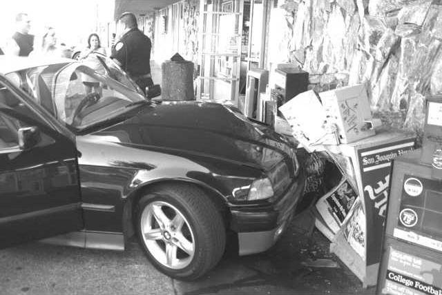 The woman had crashed into a parked 2007 Honda Pilot, damaging its left front, prior to hitting the newspaper racks. The driver’s air bag had deployed on the BMW but there were no reports of any injuries.