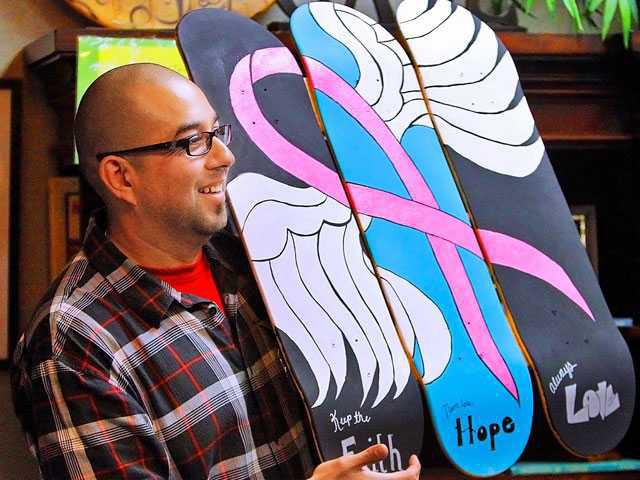 And so he fights, turning up at events near and far with his skateboard and buddies, championing Boarding for Breast Cancer of which he’s the Northern California ambassador.