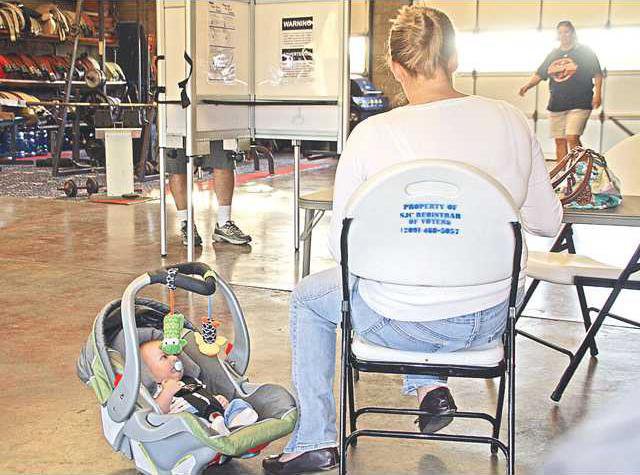 As Kristen Koehler handed in her election papers to the precinct workers, other people played goo-goo with her smiling 7-week-old son Logan in the baby carrier.