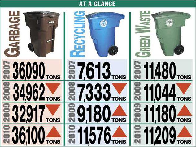 The city in 2010 collected 36,100 tons of garbage, 6,067 tons of sludge from the wastewater treatment plant, 11,209 tons of green waste, 11,576 tons of standard recyclables in blue Toters, 25,000 pounds of universal electronic waste, 52,000 pounds of computers, 11,525 gallons of used motor oil, and 750 used oil filters, and hundreds of pounds of household batteries as well.