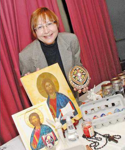 In further explaining the color scheme of icons, she said, the picture of Christ shows him wearing a blue cloak over a red robe. The red represents the royalty of the deity and the blue represents the humanity he took on becoming man.