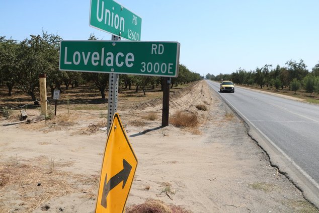This mile stretch of country road transitions from both sides being flanked by almond orchards to ending at traffic signals on Airport Way featuring an Amazon fulfillment center.