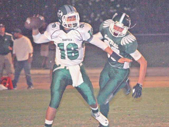 Quarterback Joe Menzel didn’t have much to do Friday night, handing off to his two-pronged running attack of Hector Soto and Michael Gonzalez. Reis said he’ll get his work in against Santa Clark Wilcox next Friday in Manteca’s home opener.