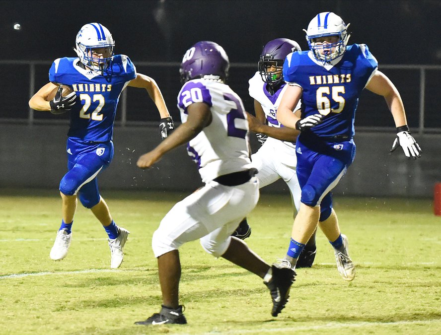 The Knights (1-1) started off the second with a bang. Derek Van Elderen (12 carries, 129 yards) raced 71 yards up the right sideline in front of the Knights bench for a touchdown on the first play of the second half to make the score 28-7. That one run would account for more than one-third of Ripon Christian’s total yardage of 198 yards.