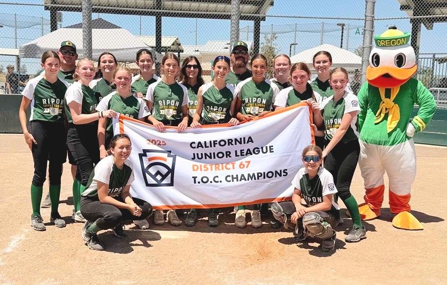 Ripon Little League’s Oregon Ducks battled two teams and the stifling heat to win the District 67 Tournament of Champions junior-division last Saturday at Legacy Fields in Tracy.